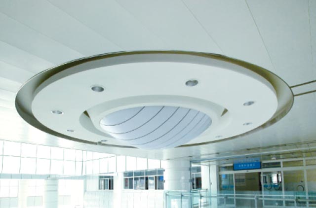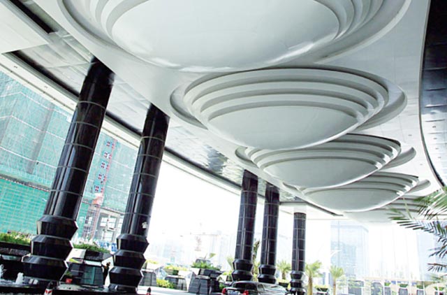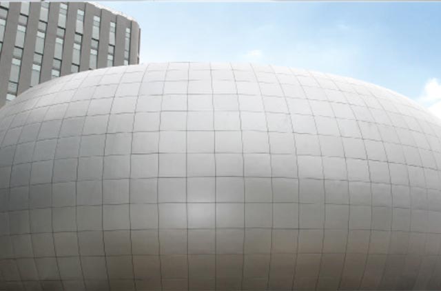 双曲板是采用德国进口万能成型机配合专用数控双曲面软件在短时间内生产出成品。版面效果比常见的通过分割焊接生产的双曲板平整度好,安装效果比所谓的“以直带曲”等假双曲的弧线圆滑,充分展示了双曲铝单板在金属幕墙上无可替代的独特魅力。