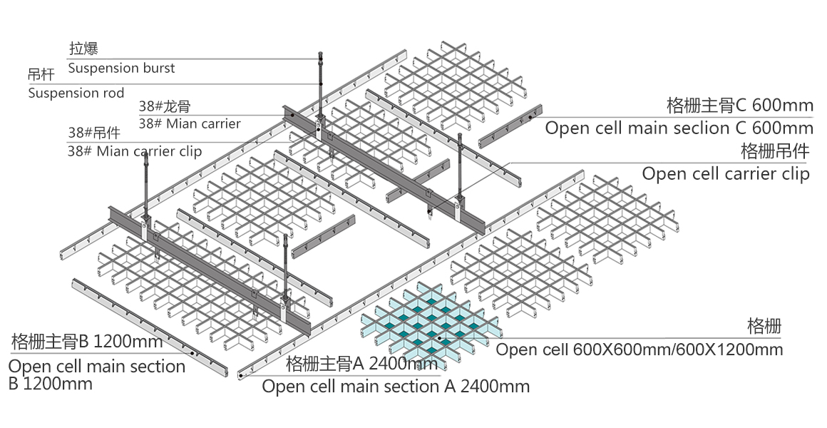 通过设计师的创意。突破传统观念,采用复合型天花,且有别于一般的格栅,美观大方,立体感强。通透结构,便于维护:由于格栅是通透式的,可以把灯具、空调系统、消防设备置于天花板内。格栅安装简单,可随意安装和拆卸,无需特别工具,方便维修和保养。