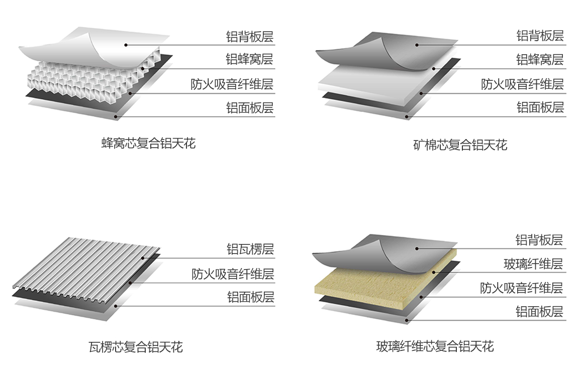 复合材料方板天花系统,由蜂窝板、瓦楞板、矿棉、玻璃纤维四种夹芯及铝板复合而成;是国内首创的暗架、明架复合材料吊顶系统,为满足客户更高级别的需求。