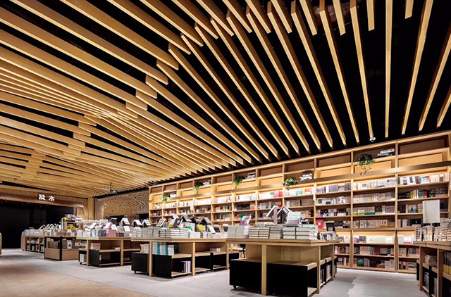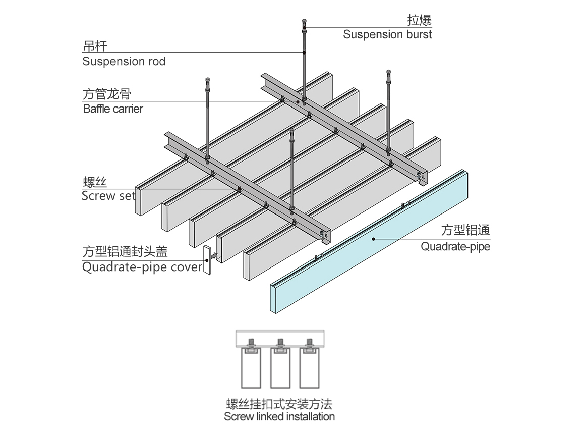 通过连续滚压或冷弯成型,安装结构为专用龙骨卡扣式结构,产品有着开透、吸音和装饰等功能,并且具备现代时尚、超前效果。通过面板高度、方向以及照明和颜色变化,将吊顶表现得更加通透和富有动感。