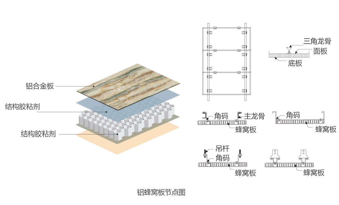 幕墙铝蜂窝板主要应用于大厦的外墙装饰,该产品选用优质的进口原材料,加工尺寸精确。表面采用现金的预辊涂氟碳漆工艺,可保持三十年不变色。本公司采用双组份高分子环氧胶膜和双组份改性环氧树脂,通过全封闭无尘作业,用全自动蜂窝复合板复合生产设备通过加压高温复合而成,使铝蜂窝板粘结更牢固,更抗弯挠,板块更平直,质量更可靠。可根据建筑设计要求制作弧板、折板及梯形板等各式异形蜂窝板。