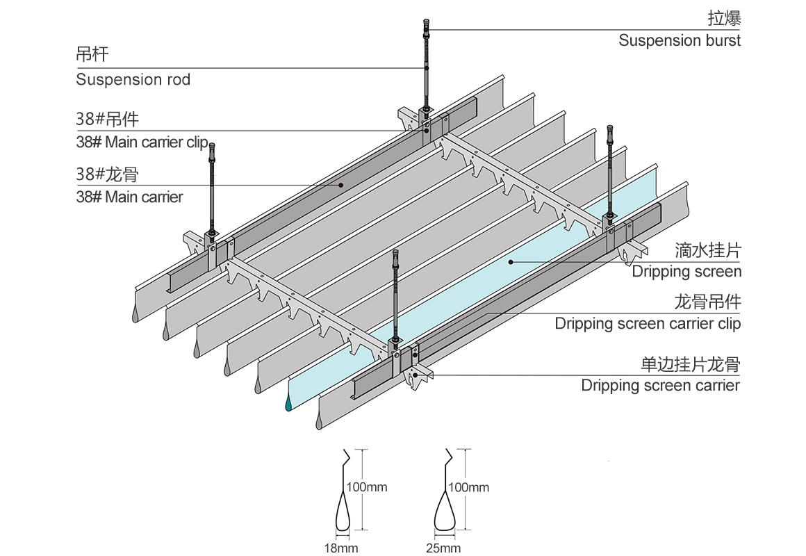 滴水挂片是呈现水滴状的一种独具特色的天花系列,富于浓烈的现代气息,完美的先开令装饰效果更加新奇。通透、明亮:滴水挂片系统通透宽敞,便于空气的流通,排气散热的同时,能够使光线分布均匀,使整个空间宽敞明亮。改善空间距离感:能使长距离空间显得更宽敞,使长形空间不再因为距离而产生局促感,简洁而非平板,充足的光感与次序感,更使空间充满时尚气息。