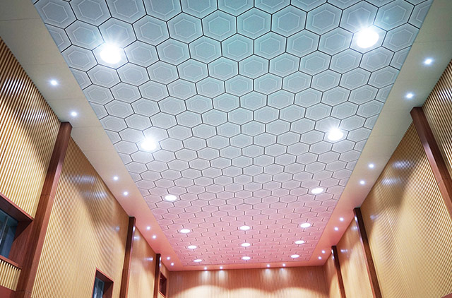 六边型铝扣板天花选用优质原生铝合金为原材料,加以表面工艺处理,进而冲压成型。常规厚度主要是0.8mm-1.0mm,可选择平面或冲孔款式。六边型铝扣板背面可加入隔音纸,有助于增加整个密闭空间的总吸收容量,降低噪音带来的影响。每款冲孔形式均可以提供不同的吸声开放面积比率(冲孔率),达到不同程度的密闭空间吸音需求。